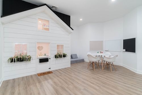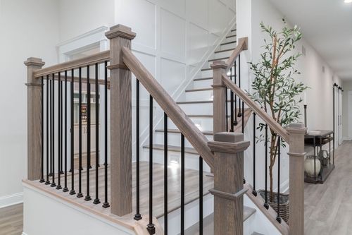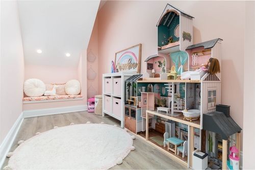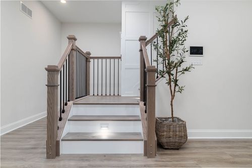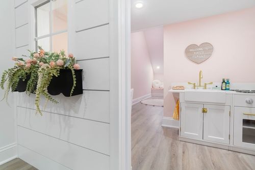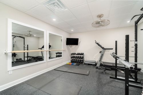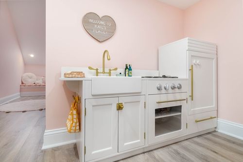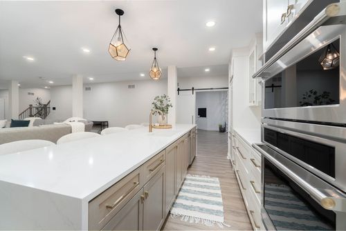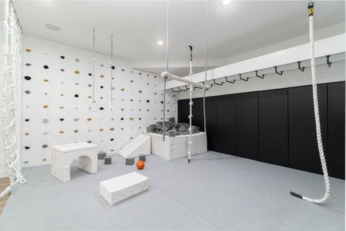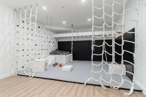 This basement project included a beautiful stairway with under-stair lighting, a home gym, a playhouse, a rock climbing wall, a kitchen, and a bathroom.
